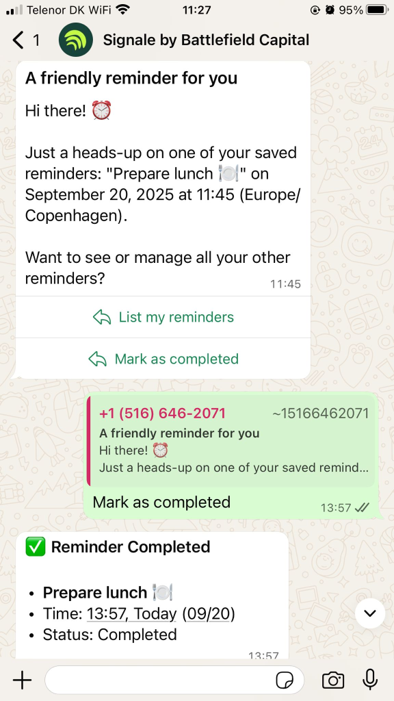 When the time comes, Signale sends a notification with interactive buttons. Users can "Mark as completed" directly in the chat, closing the loop.
