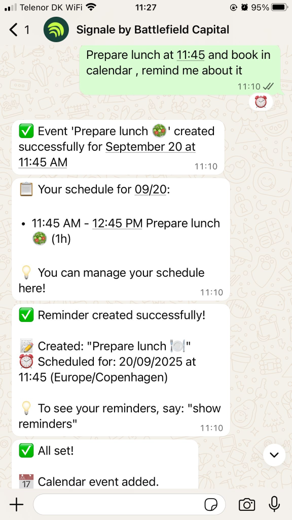 "Prepare lunch at 11:45 and book in calendar, remind me about it" - One prompt, two actions: