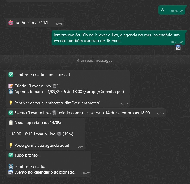 Bot Response (Translated 🇺🇸): "Reminder created successfully! Created: 'Take out trash'. Event 'Take out trash' created successfully for Sept 14th at 18:00."